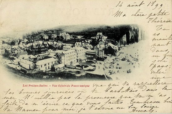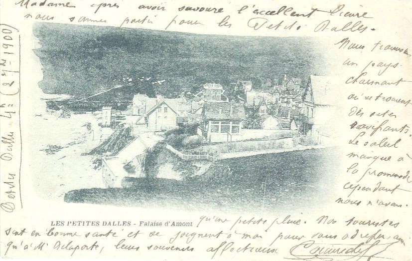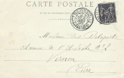 Le timbre de 10 centimes, noir sur lilas, type Sage (groupe allégorique Paix et Commerce) est recouvert par un cachet illisible. Le cachet des Petites-Dalles indique la 3ème, le 2 SEPT 00, et le cachet de Vernon indique 1E 3 SEPT 00.
