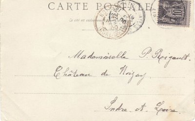 Le verso est consacré à l'adresse. Le timbre de 10 centimes, noir sur lilas, type Sage est recouvert par un cachet illisible. Le cachet des Petites-Dalles indique : 19 FE 00, et le cachet de Noisay indique : ? 00.