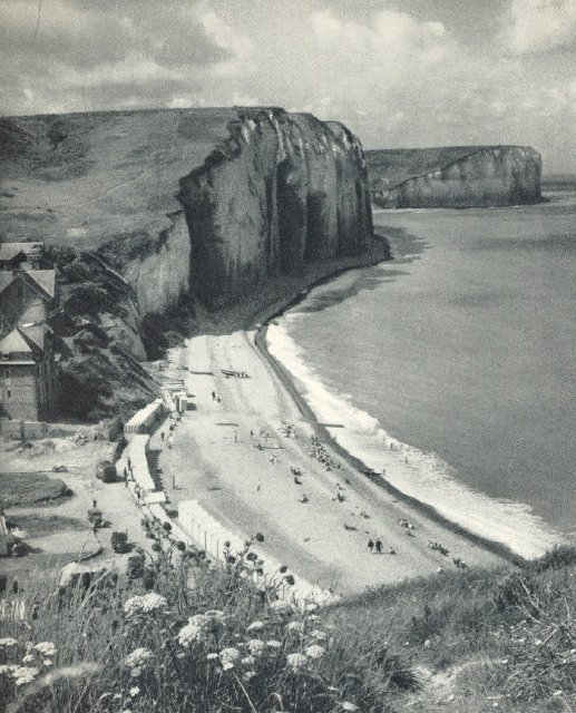 ![]() Cette photo de la plage des Petites-Dalles est extraite du livre de René Herval, éditions B. Arthaud, "En Normandie de la Bresle à la Dives", est adressée par Claudine Hamann. Elle a été prise dans l'immédiat après-guerre. Le parking n'est pas encore fait et on aperçoit à l'extrême gauche de la photo la baraque des démineurs. Par contre le toit de la villa Brise-lames est manifestement neuf, sans la cheminée qui existait avant-guerre. Je pense qu'on peut situer cette photo en 1947 (P. Wallon) |