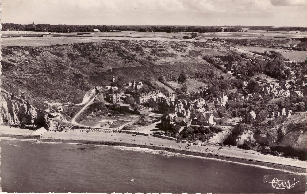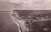 ![]() Cette carte, sans doute de la même année, représente la plage avant la reconstruction de la "Cabournette". Le petit blockhaus situé derrière le grand escalier actuel est clairement visible. Elle porte la mention "Phot. Jaouen, Petites-Dalles". Le cachet de la poste semble être le : "6-8-1951". |