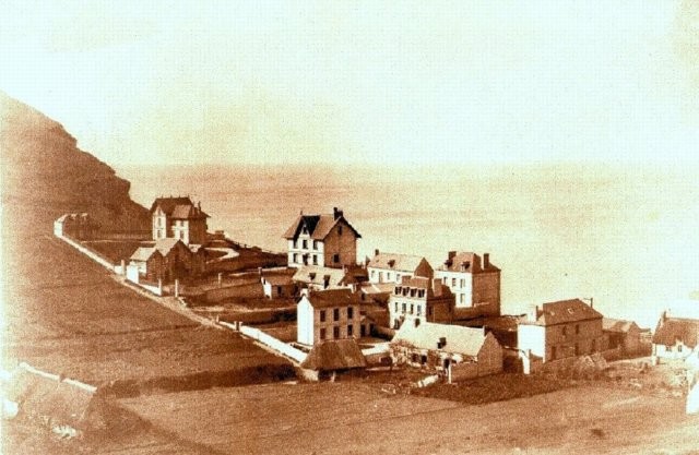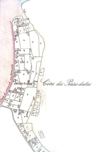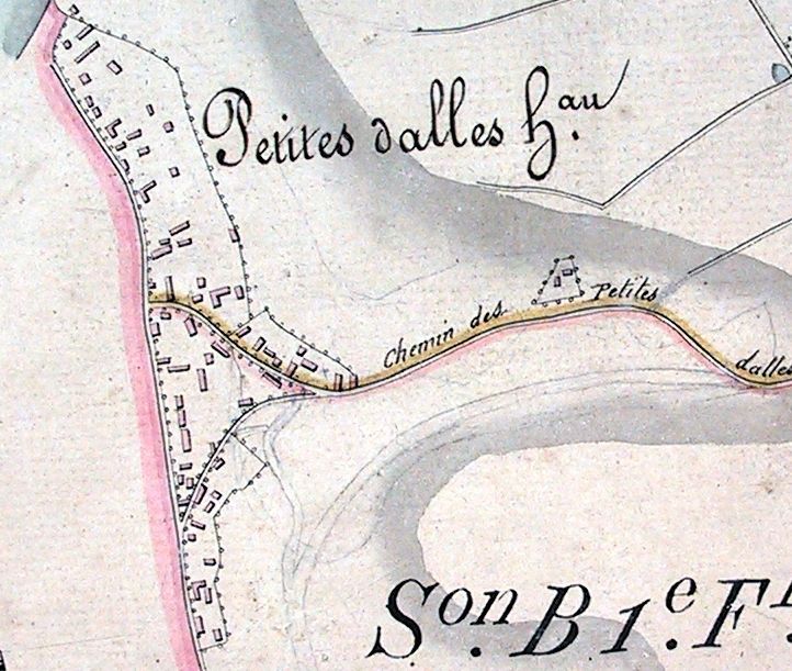 Seule la vieille route existe, elle se termine derrière la boulangère. Cette route sera prolongée, jusqu'au carrefour central actuel, vers 1879. (Le rapprochement avec la photo des Petites-dalles en 1869 est intéressant).