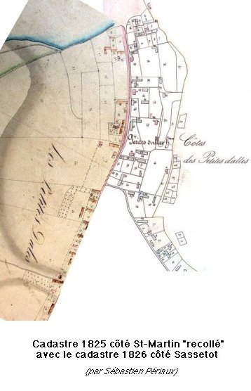 Sébastien Périaux nous a fait parvenir d'autres reproductions de ce cadastre de 1825 dont une vue d'ensemble qui permet de constater que seule la vieille route de Saint-Martin existe et une autre plus détaillée qui montre que cette vieille route se divisait en deux branches, l'une aboutissant au chemin de la boulangère et l'autre se terminant dans le chemin du Métro actuel (le trajet de l'actuelle route de Saint-Martin a été ajouté au crayon).