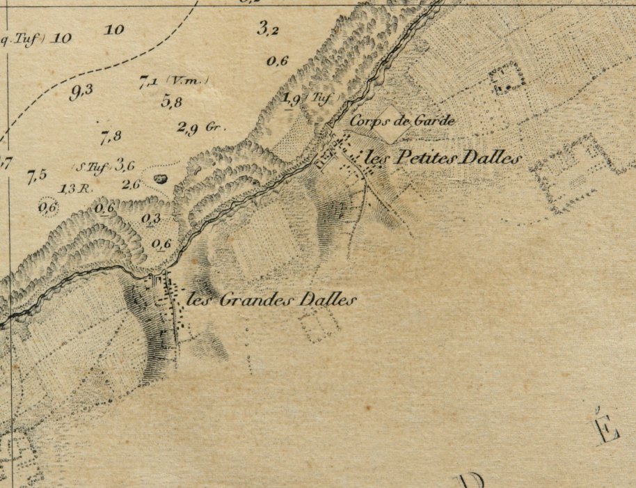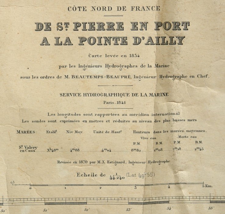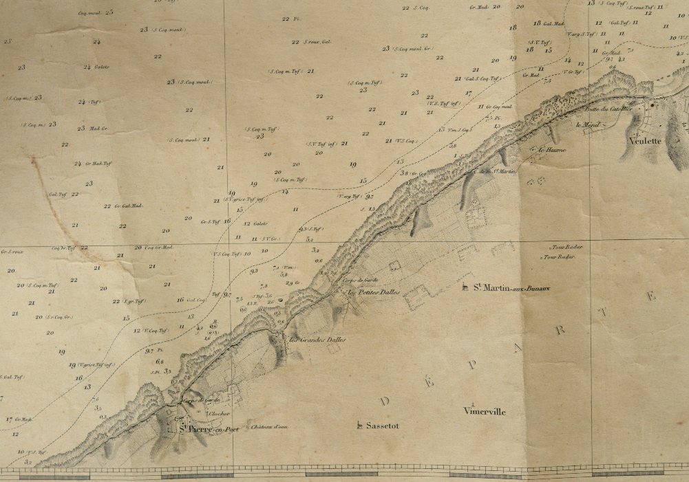 Cette carte marine datée de 1841 (levée en 1834) a été révisée et vraisemblablement utilisée depuis la dernière guerre mondiale, car y figurent à l'est de Saint-Martin-aux-Buneaux deux tours radar ! Par contre y sont toujours marqués les corps de garde disparus depuis bien longtemps.
