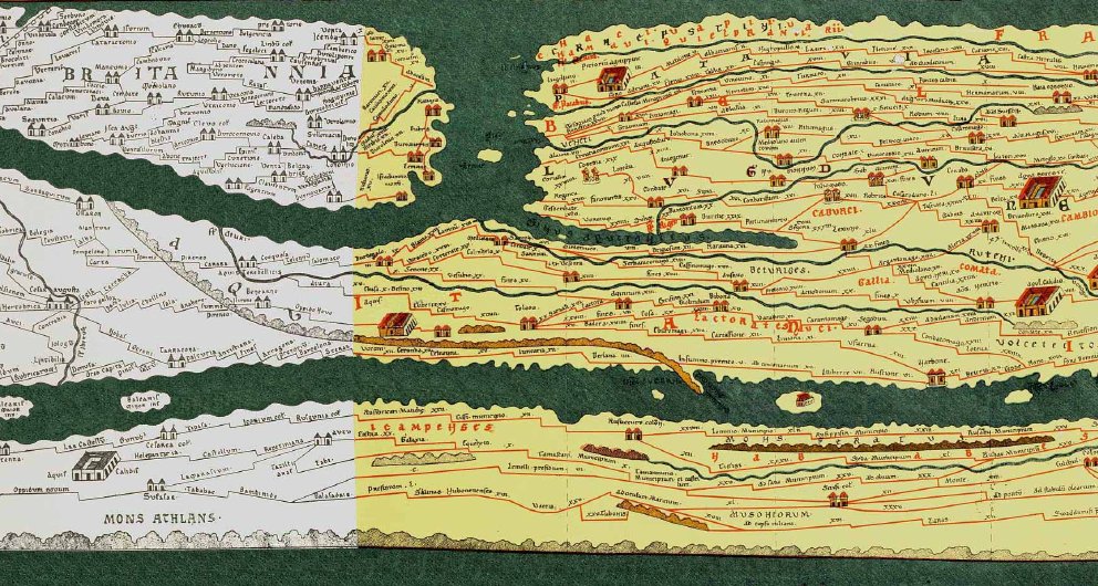 La table de Peutinger est l'ancêtre des cartes routières. Elle couvre tout l'empire romain, et même au-delà, jusqu'en Chine. C'est une reproduction, faite à la fin du XIIe siècle, d'une copie réalisée vers l'an 350, dont l'original est encore plus ancien peut-être vers l'an 250. Cette carte a été découverte au début du XVIe siècle, à Worms. Elle a été confiée à Konrad Peutinger, contemporain d'Erasme, qui la publia (d'où son nom...).