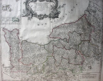A gauche, carte du XVIIIe siècle du "Gouvernement Général de NORMANDIE divisé en ses sept baillages de Coutances, Caen, Caux, Rouen, Evreux, Gisors et Alençon par le Sr ROBERT Géographe".