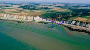 C'est exact pour la période du XXe siècle, mais cette vitesse était deux fois moindre auparavant (publications de l'université de Caen sur l'évolution du trait de côte de la Seine-Maritime). Retenir donc une vitesse moyenne de 10 cm sur 1000 ans est plus probable (soit 100 m en tout). "Faire passer la vallée entre les Catelets et "le treuil" signifie que la rive gauche de la vallée crée aussi un décalage de 100 à 150 m de la falaise de Sassetot que l'on devrait également observer, au moins partiellement." Il me semble que si l'on considère le chenal des Catelets comme le milieu de la vallée à l'époque ou elle était plus longue, il y a bien un décalage relatif. Ce qui est intéressant c'est de noter comme vous l'avez fait que le décalage est moindre, et c'est bien ce qui se passe dans les phénomènes de méandre : l'extérieur de la courbe est plus entamé, et l'intérieur moins, ce qui aurait tendance à prouver (mais ne prouve pas de manière définitive) que la vallée tournerait bien vers la gauche en direction des Grandes Dalles. Un autre indice à étudier est de déterminer si la pente amont du flanc de la falaise (donc celle de St Martin) est plus aiguë que celle aval (falaise de Sassetot). C'est ce qui se passe dans un méandre (extérieur abrupt, intérieur plus doux). Mais encore une fois, rien ne permet de conclure !
