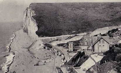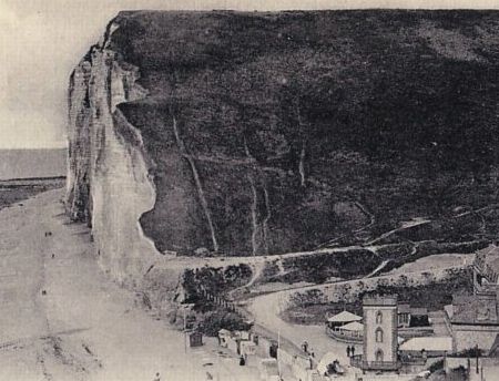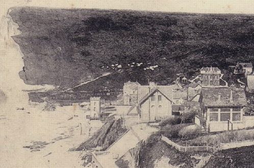 Sur cette carte postale, l'herbe couvre  les talus. La craie déversée sur la plage a disparue, emportée par la mer et en particulier lors de la tempête de 1903. L'encoche de la plate-forme  a quasiment disparue.