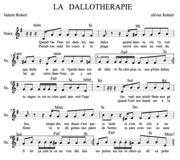 | Quand t’as le moral dans les sandales, Quand dans ta vie, t’y vois que dalle Et que tu t’ perds dans ton dédale Réfléchis plus : va aux P’tites Dalles Prends ton maillot, cours à la plage Ouvre ton âme au vent du large Entre dans l’eau, ça y est : tu nages ! Tu ressuscites, quel que soit l’âge T’as mal aux pieds, faute aux galets ? Chope des méduses, c’est pas si laid Et c’est facile à enfiler… Ca y est ! tu es un vrai Dallais… Quand l’ciel normand est à la flotte, Tu te dégottes une paire de bottes. Tu pars avec ou sans tes potes Sur les rochers, ça décapote Refrain « aux Petites-Dalles » 7 fois Soudain, il faut que tout se taise : La craie, le silex et la glaise Sculptent d’admirables cimaises ! Tu es sans voix face aux falaises... Ce sont des cathédrales, mon vieux, Que bénissent soleil et cieux Il te suffit d’ouvrir les yeux (Ou d’les fermer…) pour prier Dieu… Sais-tu qu’Il pardonne au pêcheur : Pousse ton pousseux avec ardeur Lance ta ligne au p’tit bonheur A rame, à voile ou à moteur J’ai oublié de te parler Des flammes qui dansent dans la ch’minée Des tartes aux pommes, des bols de thé Et du calva à siroter Refrain « aux Petites-Dalles » 7 fois (doucement) Le mal de vivre, moi je le soigne : Je mets la mer à la campagne Et puis je joue à qui perd gagne… Et, quand tu veux, tu m’accompagnes… Refrain « aux Petites-Dalles » 7 fois |