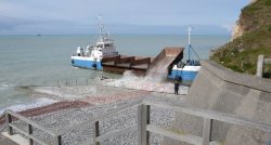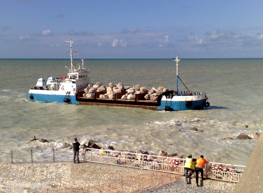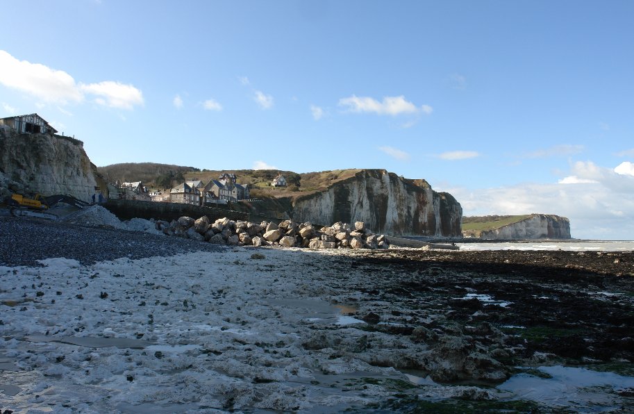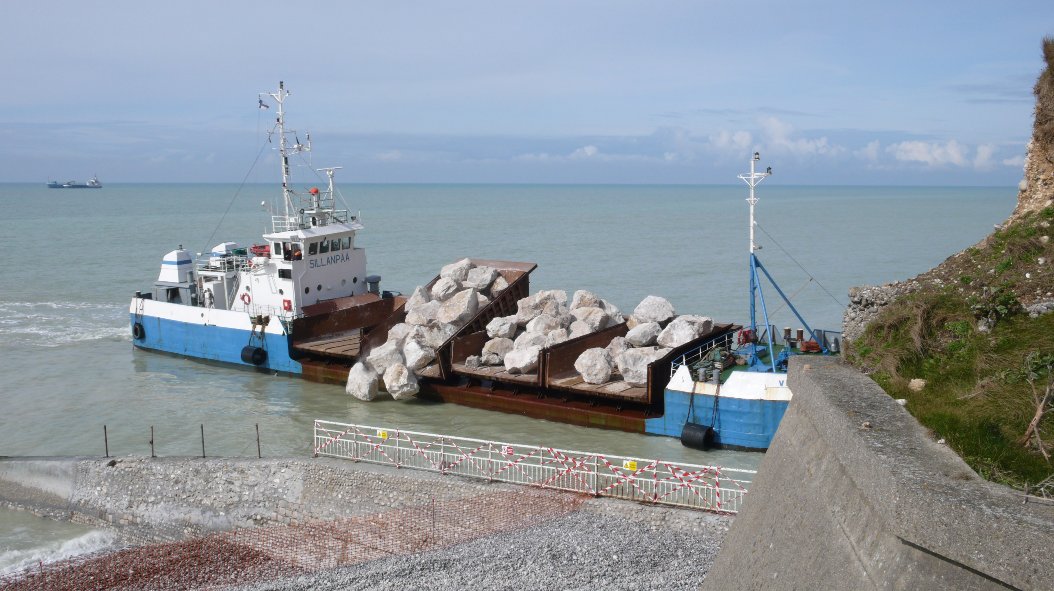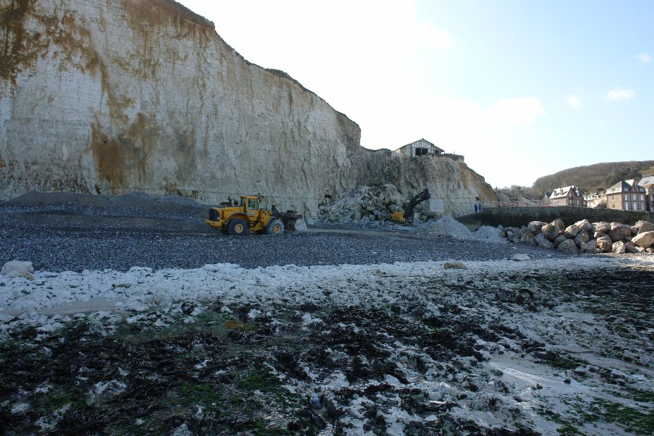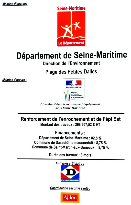 Enrochement de la plage au nord de l'épi de Saint-Martin L'enrochement le long du flanc nord de l'épi côté Saint-Martin, qui était prévu pour cette année, va se faire ce mois-ci, en mars 2008. C'est un chantier assez considérable : 3.000 tonnes de roches seront amenées de Boulogne. Initialement, ces roches devaient être livrées par une centaine de camions de 30 tonnes chacun, ce qui aurait obligé à interdire le stationnement dans la rue des Petites-Dalles pendant la durée des travaux, au moment des vacances de Pâques, avec un risque important de dégâts de la chaussée et de la descente à la plage. Finalement, malgré le surcoût d'environ 8.000 euros, les roches devraient être amenées par la mer grâce à des barges qui viendraient s'échouer sur la plage à marée haute. La plage sera fermée au public durant ces travaux qui doivent durer 5 semaines. Le but est de ralentir la sape de la falaise où est située la Cabournette et d'éviter que l'épi de Saint-Martin ne finisse par s'effondrer miné à son flanc nord par les vagues. Ce chantier est financé à 85% par le Conseil général et à 15% par les deux communes, Saint-Martin et Sassetot. Pour ce faire, ces communes ont dû prendre un emprunt sur 10 ans. Informations fournies par Philippe Duboc |