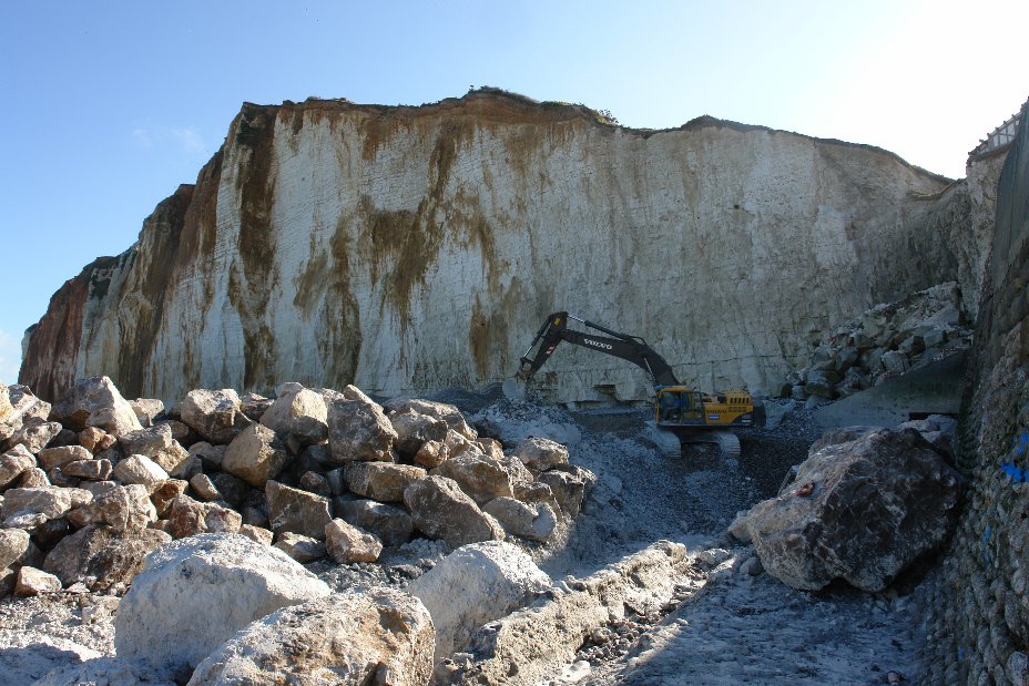 Les travaux ne sont pas terminés. Une nouvelle livraison de quelques centaines de tonnes de roches doit avoir lieu dans 15 jours pour finir de combler l'espace jusqu'au pied de la falaise.