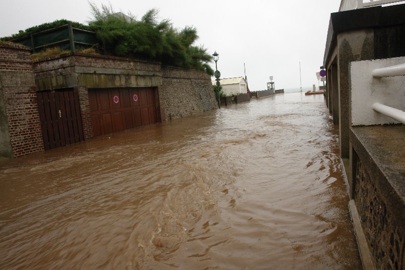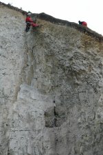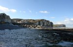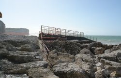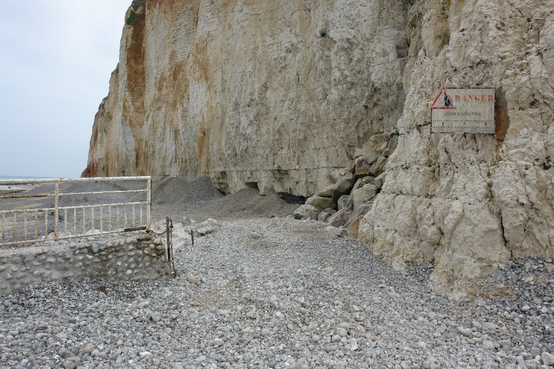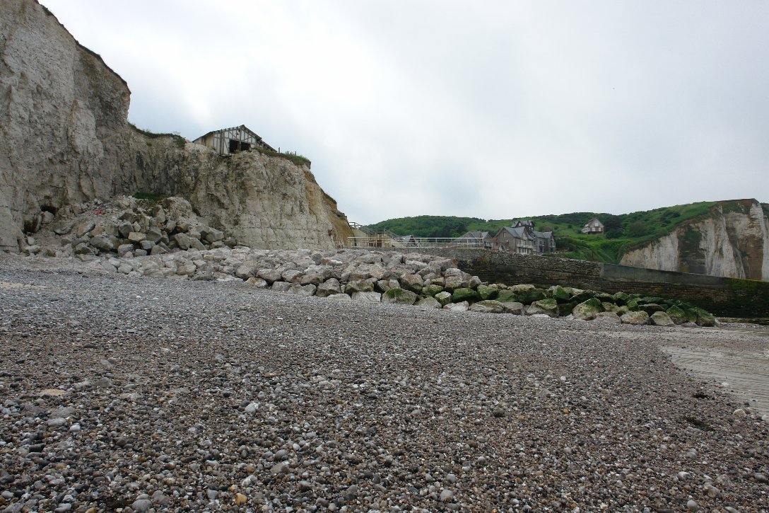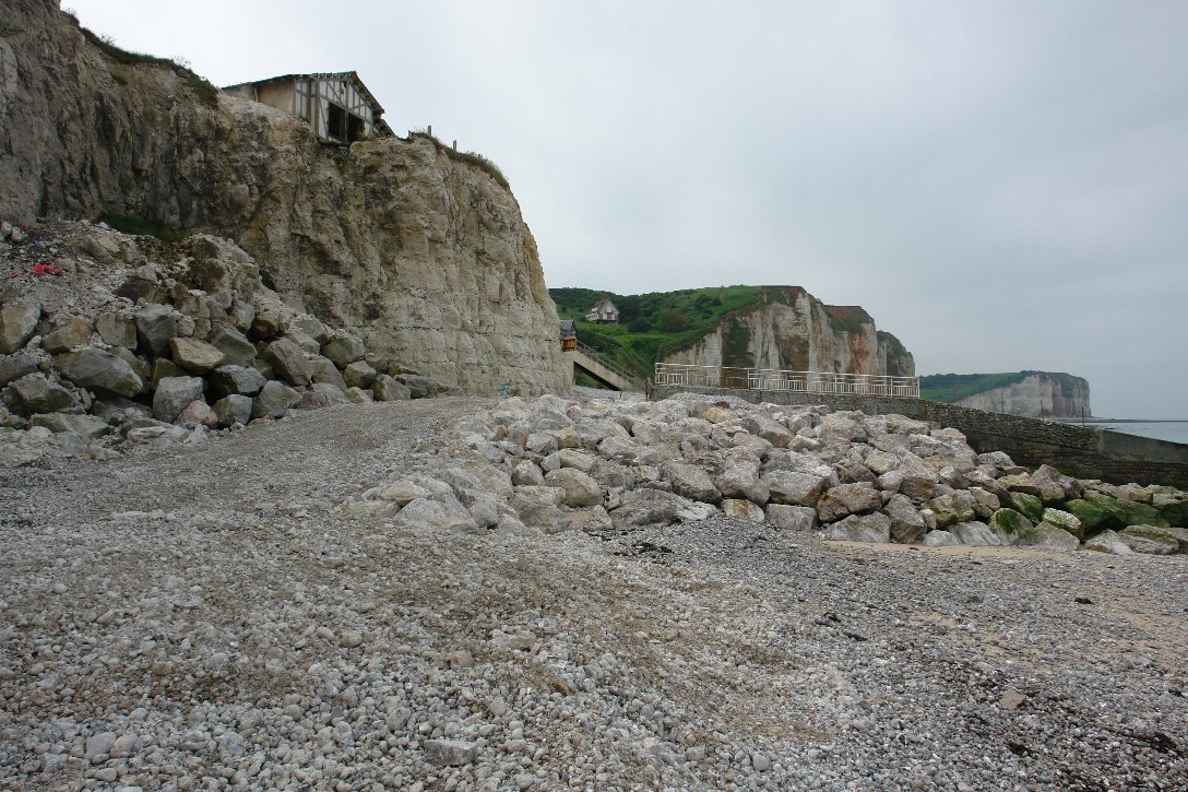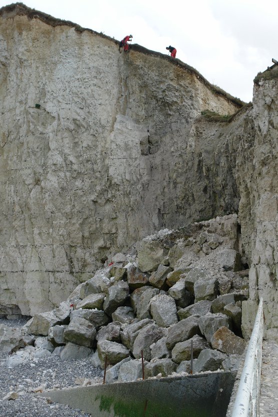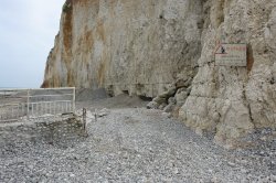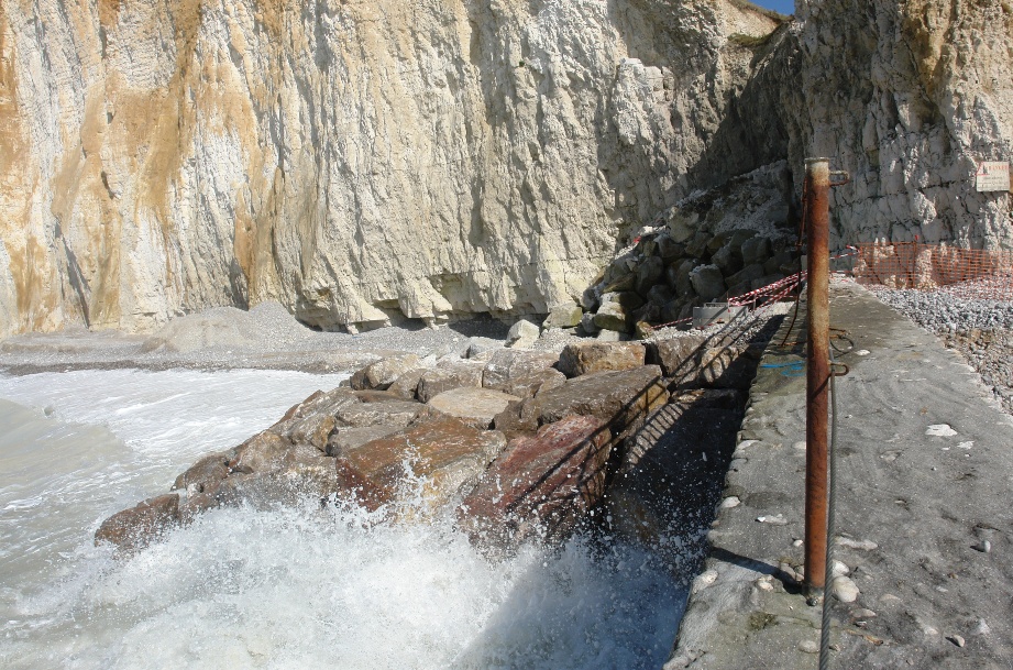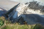 ![]() On aperçoit le haut de la buse de drainage du pluvial. | ![]() Par mer forte, les vagues ne battent plus le bas de la falaise. |