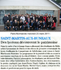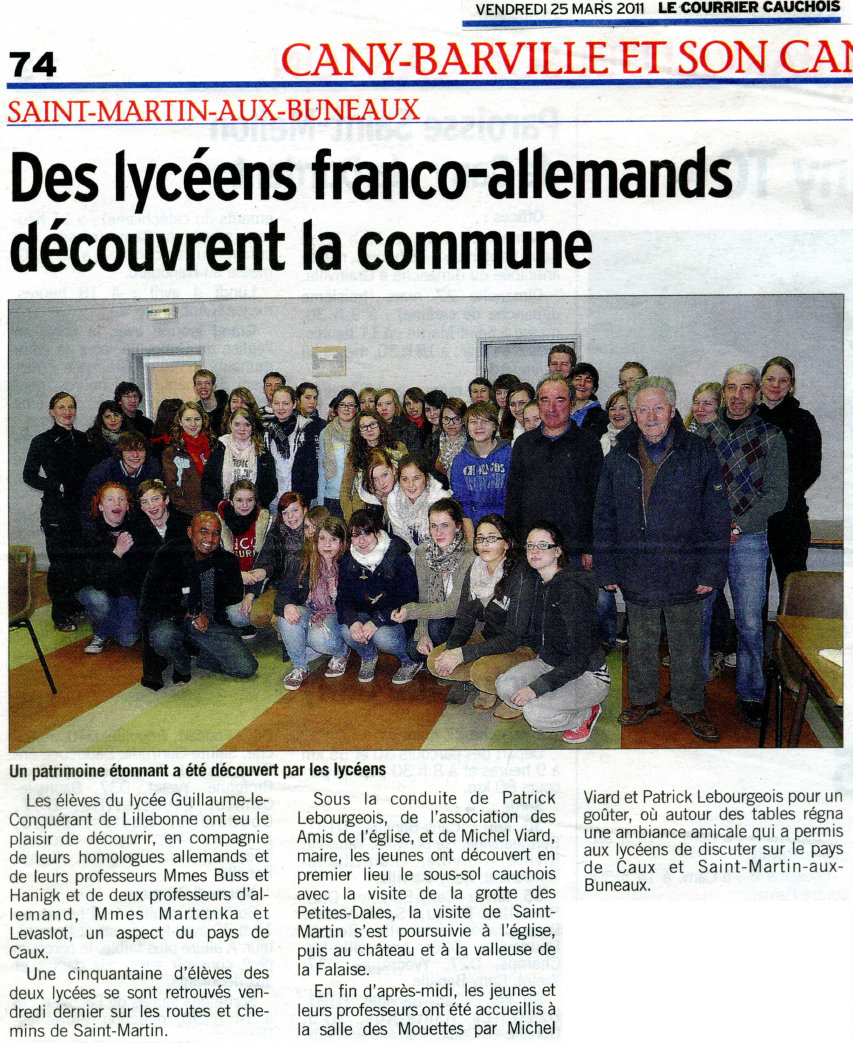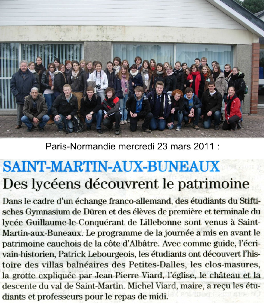 Le vendredi 18 mars dernier des élèves du lycée de Lillebonne, avec un groupe de lycéens allemands, ont été reçus par la Commune de Saint-Martin-au-Buneaux et ont visité à cette occasion les Petites-Dalles et ses villas balnéaires sous la conduite de Patrick Lebourgeois.