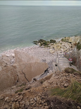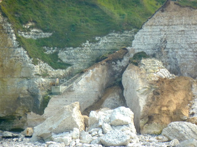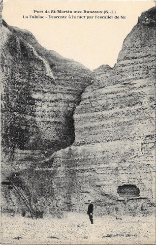 Dans la nuit du 6 au 7 août 2016, un pan gigantesque de la falaise au Port de Saint Martin s'est effondré, arrachant et écrasant l'échelle de métal qui permettait depuis des décennies aux Saint Martinais, estivants comme habitants, et aux amateurs de lieux pittoresques d'accéder à la mer. L'éboulement s'est, semble-t-il, poursuivi les jours suivants. Un coup de semonce avait été déjà donné quand au printemps, en amont, à quelques mètres de la descente, un pan de taille plus réduite s'était abattu, faisant disparaître les "grottes" qui servaient aux pêcheurs pour y mettre leur matériel à l'abri. Les ânes et mulets de l'exploitation du galets, ainsi que l'outillage et leurs équipements, harnais et bâts, étaient parqués dans une grotte servant d'écurie du côté aval, vers les Petites-Dalles. Il y avait dans cette grotte la place pour quatre animaux. |