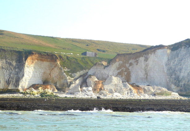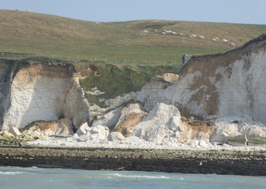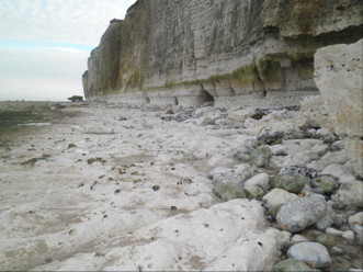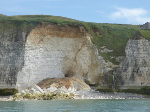 "n'était pas un bon présage". Et voilà. Ce matin, 15 août, des géants de calcaire striés de silex gisent en contrebas, la descente est éventrée comme si elle avait été dynamitée. Les vagues calmes lèchent les premiers blocs qui ont roulé le plus loin. L’échelle est broyée, désarticulée sous une masse inerte. Le limon qui surplombait auparavant la paroi est désormais affaissé à quelques mètres du rivage. |