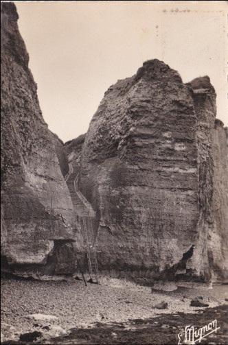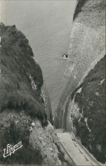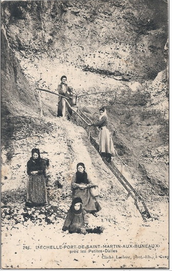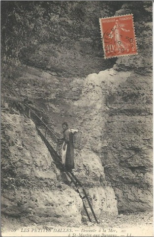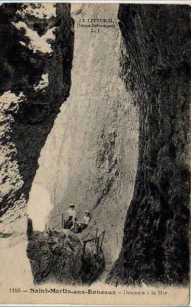 aoûtiens”. Au 19e siècle, cette corniche se prolongeait vers l'amont comme un chemin de ronde médiéval avant de laisser les promeneurs encostumés et les promeneuses en robe longue descendre par une échelle plus petite fouler la grève. Les ramasseurs et ramasseuses de galets eux descendaient quotidiennement dans leurs rudes habits de normands cauchois industrieux et affairés. |