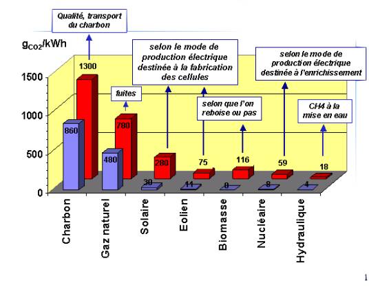 La figure 2 donne l’éco-bilan des différentes sources de production électrique en émission de CO2 : pour chaque source, les deux données correspondent aux valeurs extrêmes possibles.