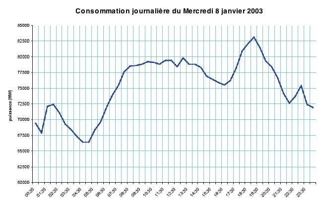 La France est divisée en 7 régions et la journée en 48 tranches horaires. Chaque jour, on dispose pour le lendemain des prévisions de température et de nébulosité permettant de fixer à chaque instant la consommation estimée. En hiver, par exemple, une variation de ±1°C correspond à une puissance de ±2100 MW (en été seulement d’environ 450 MW) ; la nébulosité du ciel, classée de 0 à 8 (octa) permet aussi d’estimer la demande nécessaire (650 MW par octa).