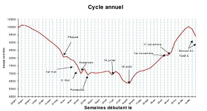 Pour cela, le CNES (Centre National d’Exploitation des Systèmes) de RTE (Réseau de Transport Electrique) (filiale d’EDF) dispose de courbes de consommation moyenne journalière, mensuelle et annuelle qui sont actualisées tous les jours en fonction de la température, nébulosité et activité (figure 3).