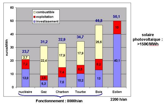 - Actuellement le coût est de 1 à 1,3 M€/MW pour le terrestre et de 2 à 2,3 pour l’off-shore, qu’il faut comparer au coût d’investissement d’un EPR (3 à 4 Mds€) soit entre 1,8 et 2,3 M€/MW. Ce coût d’investissement doit être relativisé par d’une part la durée de vie de l’installation (20 à 30 ans pour l’éolien terrestre, ?? pour l’off-shore et 80 ans pour l’EPR) et le coefficient de disponibilité (25% pour l’éolien terrestre, 40% pour l’off-shore et 90% pour l’EPR) qui réduit d’autant la puissance réellement disponible. Ajoutons également le coût du démantèlement de l’ordre de 1 M€ pour une éolienne terrestre de 3MW.