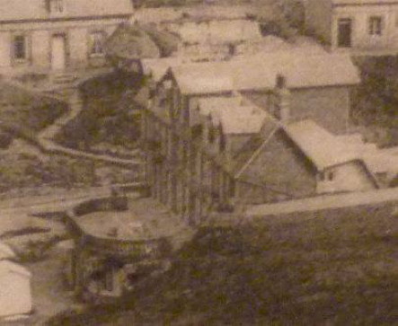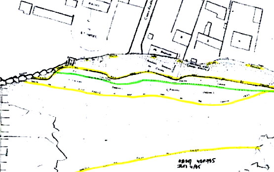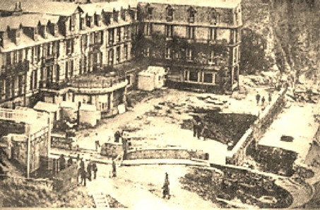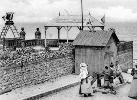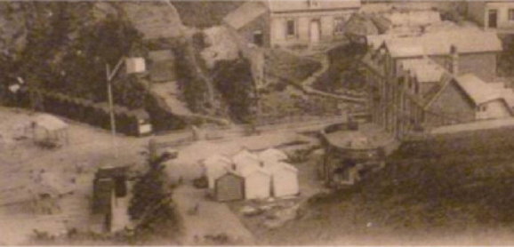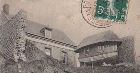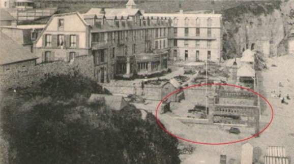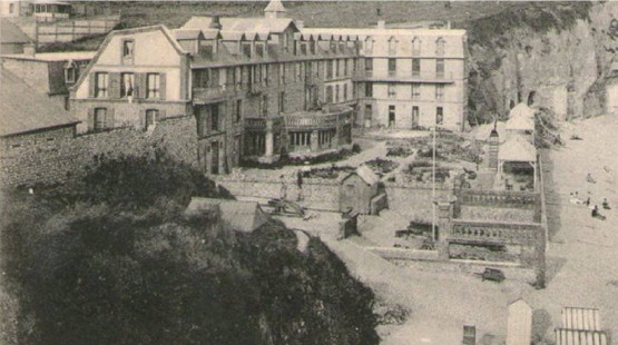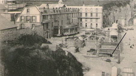 | Arguments affaiblissant l'hypothèse d'un chemin... Cette hypothèse repose sur le fait que la mer était plus reculée par le passé... Un chemin aurait pu comme aux Petites-Dalles avancer sur le rivage. Cependant la question se pose de sa forme et de son orientation. La fonction du chemin n'étant pas de retenir les galets son orientation ouest ne semble pas se justifier ni même sa forme en coude. Par ailleurs comment expliquer des constructions que d'un côté de ce chemin, rien n'empêchait la présence de constructions de part et d'autre. Pour illustrer cela, je reprends la carte concernant l'hôtel Bouillon aux Petites Dalles et qui était installé en partie sur le rivage... Et qui fut emporté par une tempête... | ![]() |