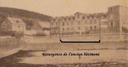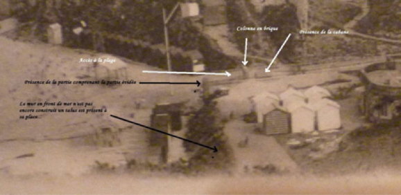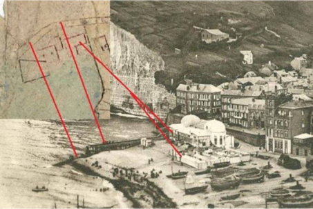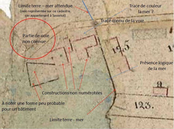 D'un côté le cadastre indique un bâtiment en front de mer parallèle au rivage, de l'autre côté la carte postale aussi. Oui, mais voilà celui de la carte postale va de la falaise à la route, mais pas celui du cadastre qui semble plus petit. |