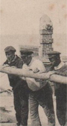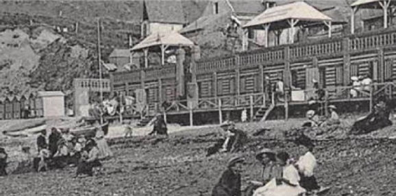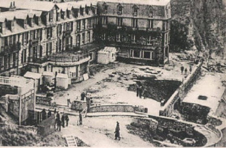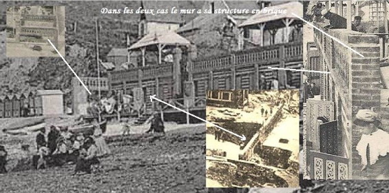 Sur une autre carte postale, il est possible de constater la même situation, mais là la cause semble en être une tempête : L'hôtel de la plage a été fortement touché par la tempête. Plusieurs effondrements de terrain sont apparus. Par endroit il ne reste plus que l'encadrement en brique du mur, la partie en ciment emportée par la mer laisse un vide au centre créant ainsi une communication directe entre le front de mer et la mer... |