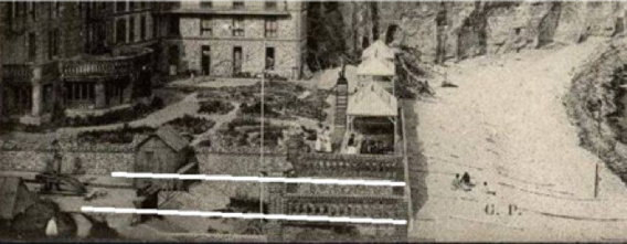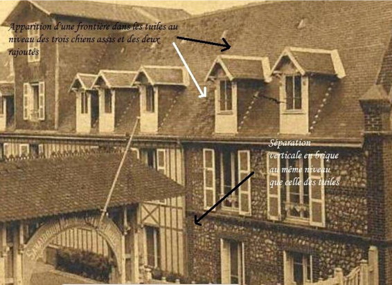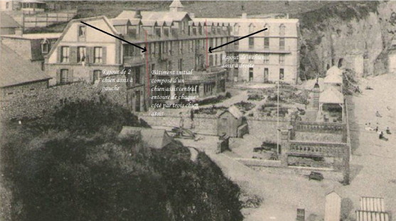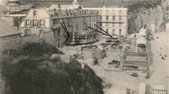 Et si il y avait encore un truc, un quelque chose qui cloche, qui colle pas et qui conduirait à penser qu'une structure a existé en front de mer et évidemment à l'endroit où je suspecte l'existence d'une jetée... Pour ça il faut revenir à une des plus anciennes cartes postales des Grandes-Dalles celle où l'hôtel n'est qu'un bâtiment composé de sept chien-assis. Je vous laisse regarder, c'est là devant vos yeux... il y a truc énorme !!! |