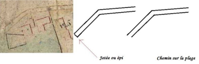 6) Chemin, jetée ou épi sur le cadastre de 1824 Un trait qui pourrait avoir son importance... Concernant le cadastre de 1824, intéressons-nous au prolongement de la voie qui traverse les Grandes-Dalles et qui avance vers la mer. Cette avancée pourrait-être un épi ou une jetée, ou encore un chemin sur la plage dans sa partie restant hors eau. Dans ce dernier cas il n'y aurait pas une limite précise de fin et donc pas de trait contrairement à un épi ou à une jetée. Bon je ne sais pas si je suis clair donc voici un schéma... La réponse est dans le cadastre et cette partie de celui-ci comporte une froissure à cet endroit rendant la lecture difficile... |