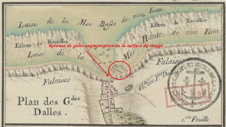 | Un mystère aux Grandes-Dalles... Voilà ce que je n'arrive pas à comprendre, c'est là en bord de mer, devant vos yeux, sur ce cadastre de 1824... C'est surprenant non ? Voilà, le cadastre de 1824 laisse apparaître des constructions non numérotées en bord de mer, la question de savoir ce qui est représenté là se pose. | ![]() |
