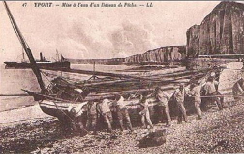 Une étrange analogie entre le cadastre napoléonien des Grandes-Dalles et ce que l'on observe à Yport... Présence aux Grandes-Dalles d'un bateau trois fois plus grand qu'une caïque yportaise. Sur le site des Petites-Dalles, Jean-Claude Michaux précise : --- Dans un mémoire de la marine de 1728, François Sicard (9), dans la partie consacrée à la pêche dans l'Amirauté de Saint-Valery-en-Caux, nous donne des indications chiffrées précises sur les flottilles des ports..."aux Grandes-Dalles, 1 bateau de 20 tonneaux, 8 de 5 tonneaux et 4 pêcheurs riverains." ...L'équipage de bateaux de 6 tonneaux devait être comparable à celui des caïques d'Yport... --- La question se pose de l'échouage d'un tel bateau. Pouvait-il être échoué par remontée au cabestan ou bien laissait-on la marée descendre pour l'échouage. Et dans ce cas la présence d'une jetée sur laquelle on pouvait l'amarrer à marée haute ou moyenne n'était-elle pas une aide voire une condition nécessaire ? Imaginez ce bateau faisant trois fois cette taille là...et imaginez son échouage... |