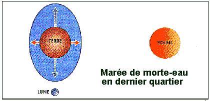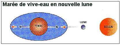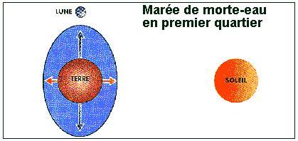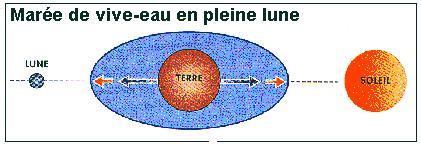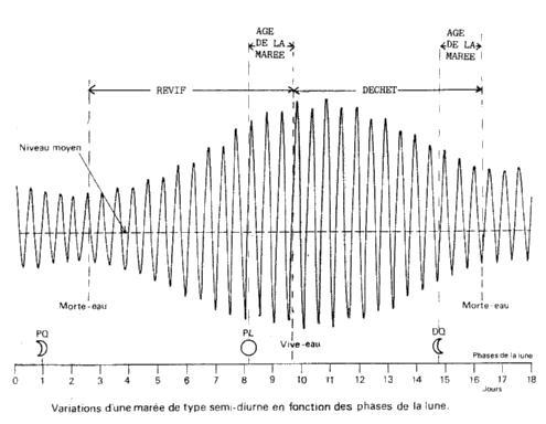 1°) Marées : « Mouvement oscillatoire du niveau de la mer dû à l'attraction de la Lune et du Soleil sur la masse d'eau des océans. ». En fait, il s'agit d'un phénomène complexe qui résulte de plusieurs facteurs dont les principaux sont : la position relative de la Terre, du Soleil et de la Lune, mais également du contour et de la profondeur des bassins concernés. C'est une superposition d'ondes qui donnent en définitive l'heure et l'amplitude des marées.