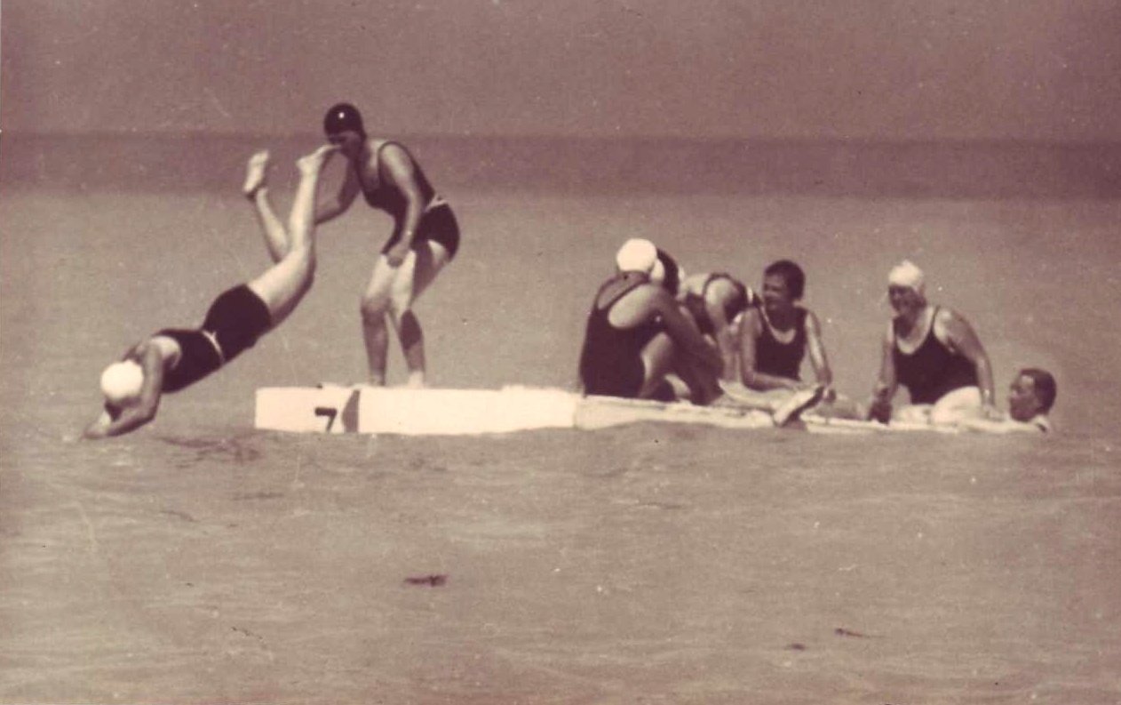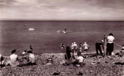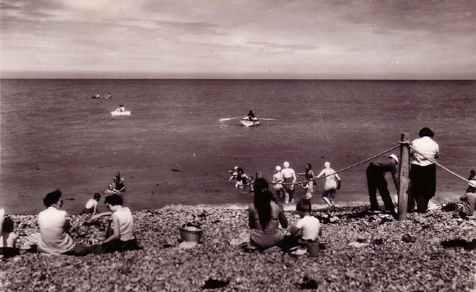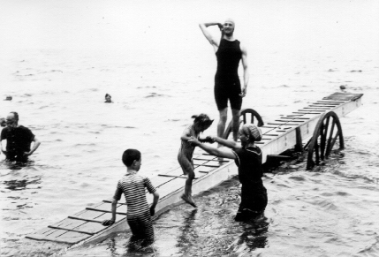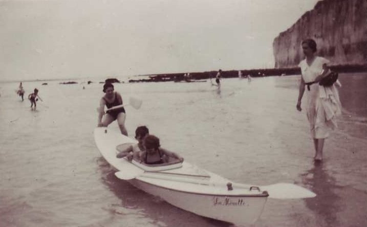 Deux photos de la plage prises en 1934 (fond Wallon): une périssoire, elles étaient fabriquées à Fécamp, et le radeau qui n'a pas changé depuis cette époque. |