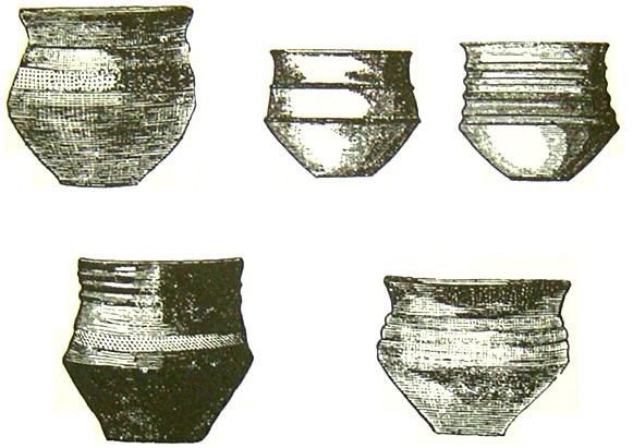 Poteries en terre noire découvertes en 1864 dans les tombes du cimetière franc des Petites-Dalles. (Musée de Rouen).