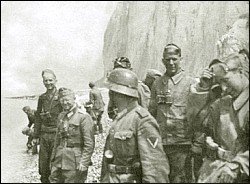 Comme nous approchions de la route Cany-Fécamp, une estafette du bataillon de reconnaissance m'informa que le capitaine von Luck avait rencontré des colonnes de camions et qu'il avait entrepris de les rassembler. Nous nous y rendîmes aussitôt et constatâmes que, si quelques véhicules ennemis s'étaient déjà échappés vers l'ouest, il en était d'autres, arrêtés sur la route, qui se dirigeaient vers l'est. Ils semblaient constituer une formation considérable. J'ordonnai aux chars de tête, qui étaient en train d'arriver, ainsi qu'aux voitures blindées et aux canons antiaériens légers d'ouvrir immédiatement le feu sur elle. Bientôt apparurent de nombreux soldats britanniques et français, courant sur la route dans notre direction ; un interrogatoire rapide révéla que c'était le commencement de la 31e division française, qui devait s'embarquer à Fécamp dans l'après-midi. Quelques éléments britanniques s'y trouvaient, dispersés. Cette colonne fut vite rompue, et, tandis que les blindés et les canons antiaériens arrosaient la route au-devant d'eux, la tête de notre division reprit à grande vitesse sa marche à la mer. Accompagné de mon équipe de signalisation, je partis devant le régiment par Les Petites-Dalles (à 20 kilomètres à l'est de Fécamp et à 9 kilomètres à l'ouest de Veulettes) en direction du littoral.